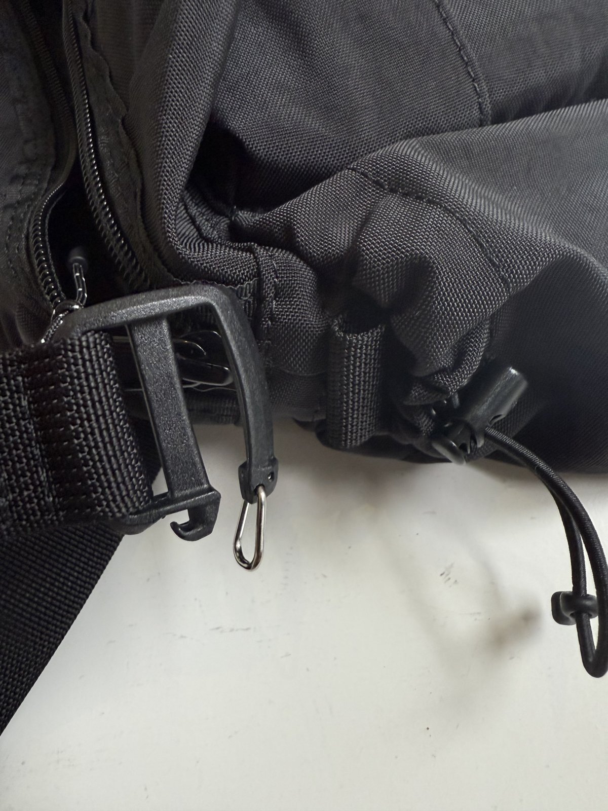 両サイドには飲み物や折りたたみ傘を収納できるドローコード付きのポケット、前面にはクッション材を仕込んだポケットがあるので、スマホやモバイルバッテリー、財布、電子タバコなどなど収納ください。SWITCHも入っちゃいます。